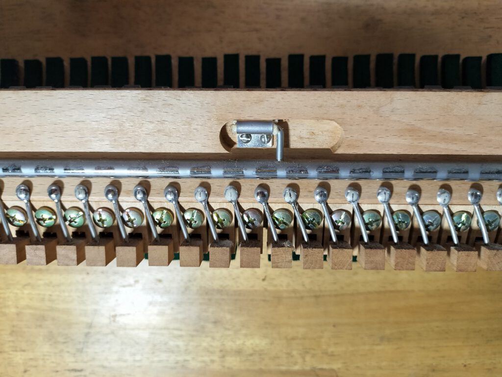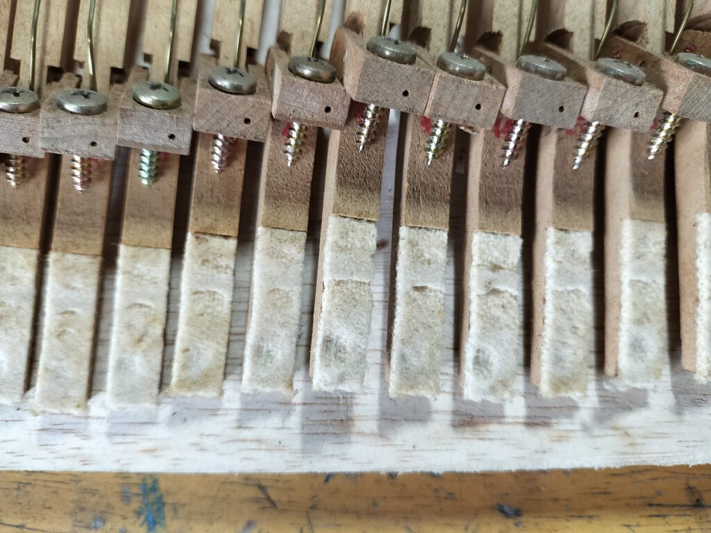 虫食いがあるなー、とハンマーレールを動かすと、ハンマーレールと赤いフェルトの間に大量の虫のなきがらが。。