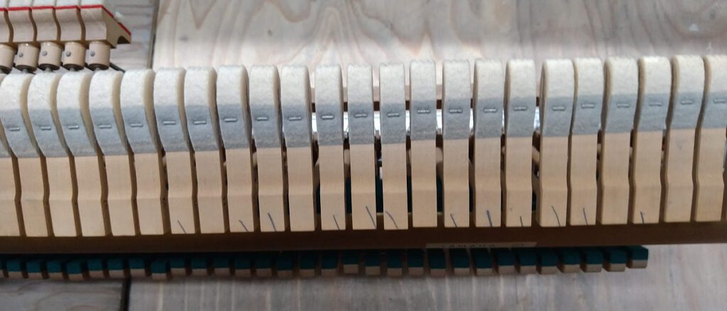 ぱっと見のピアノの印象としては、さらっとしていて、木部にもしみもなく、どちらかというと乾燥よりで、修理なくご使用いただけるかな?と思ったのですが、ハンマーヘッドに鉛筆のしるしがあって、確認してみると、そこも含めて、動きが悪く、戻りが悪い状態でした。
