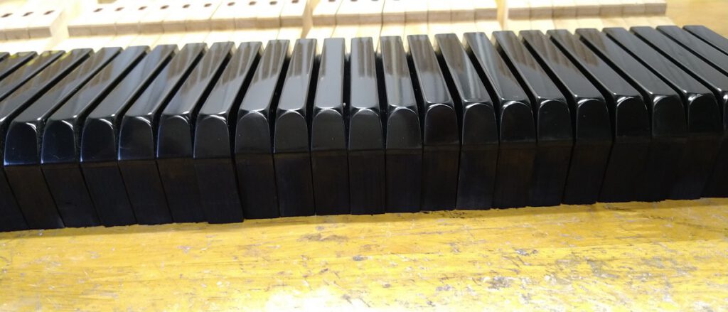 お預かりしている鍵盤のブッシングクロスは貼り終えていたので、各処理をして黒鍵のクリーニングを。