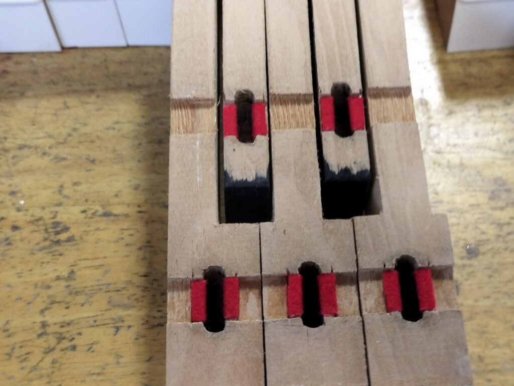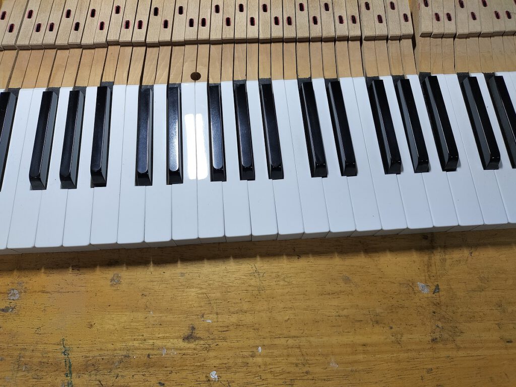 木部の汚れをきれいにして、白鍵のサイドの汚れの除去、黒鍵の黒ラックの再塗装、ワイヤー磨き、鍵盤のバフ掛けをおこなって、鍵盤の作業は終了しました。