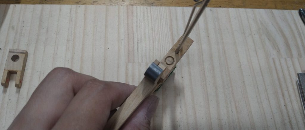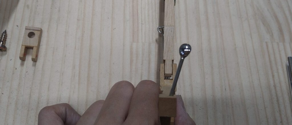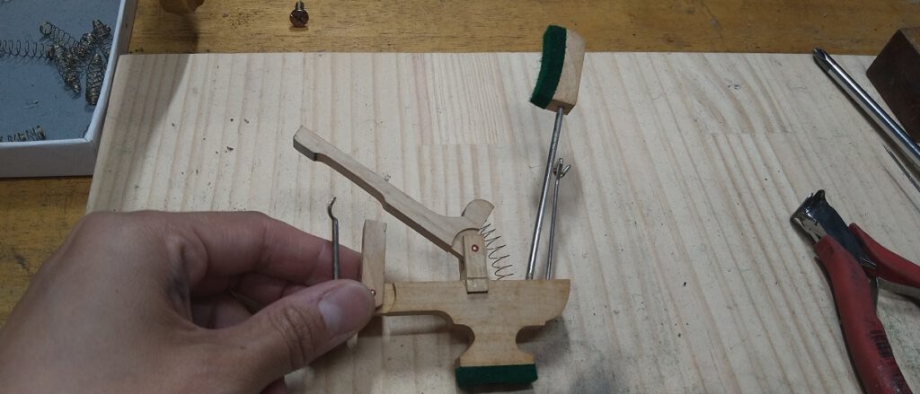 ワイヤーを磨いたり、バックチェックについたキャッチャースキンや、ウイッペンパーツのクリーニングをしながら、ウイッペンセンターピンの交換とジャックスプリングの交換を行います。