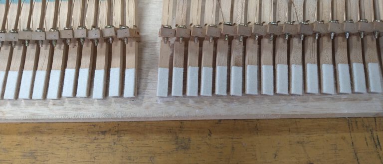 松山市・カワイDS60の鍵盤のクリーニングと、新居浜市・カワイOP32の鍵盤のブッシングクロスを取り除きました。